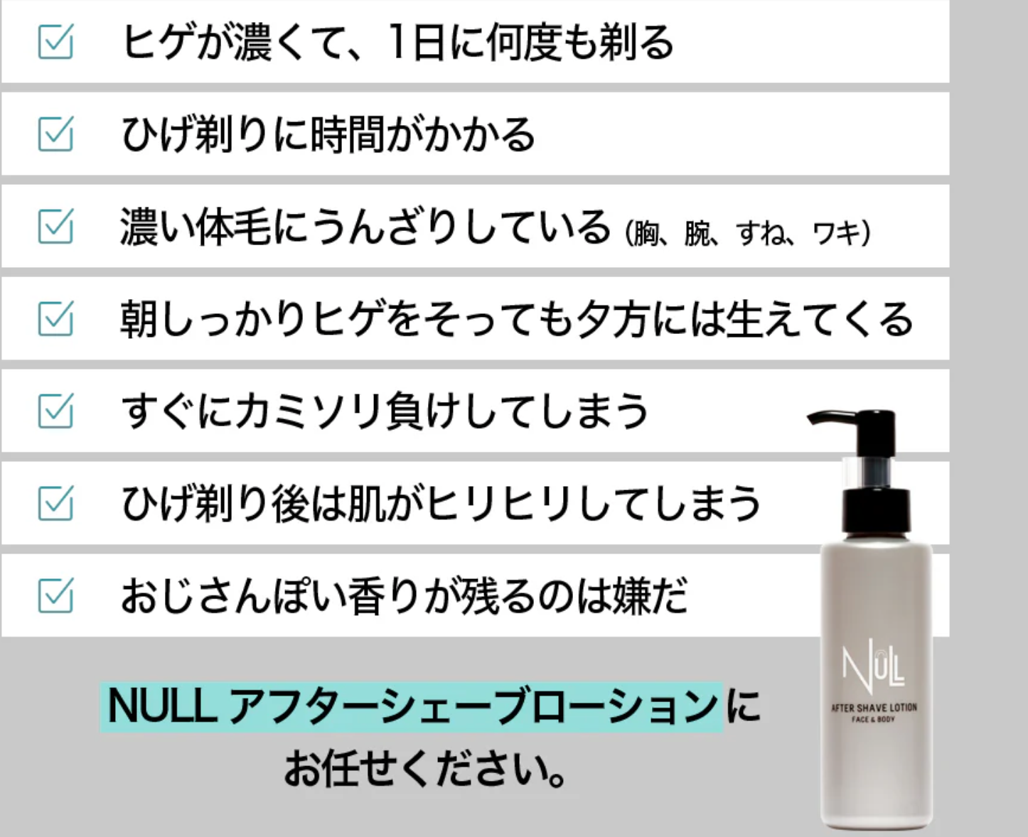ベタつかず快適、顔から体まで一本で完了。NULLのアフターシェーブローションは、時短・コスパ・心地よさのバランスに優れ、続けるほど日々の身だしなみがラクになります。シェービング後のケアをもっとシンプルに、もっとスマートに。気になった今が、始めどきです。