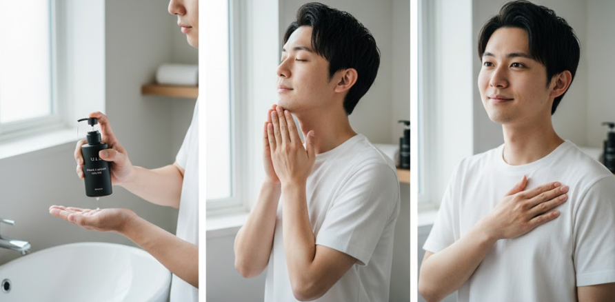 - 適量を手に取り、ヒゲ剃り後のフェイスラインや首元にやさしくなじませます。