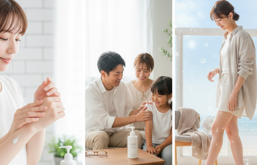 敏感肌や子どもの肌にもやさしい処方なので、家族全員で毎日のスキンケアに取り入れられます。 - 季節を問わず使いやすい