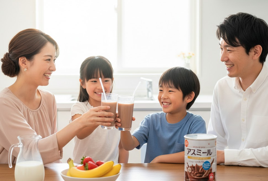 アスミールは、子どもに人気のまろやかなココア味で、牛乳や豆乳に混ぜても自然に溶け、飲みやすいと好評です。