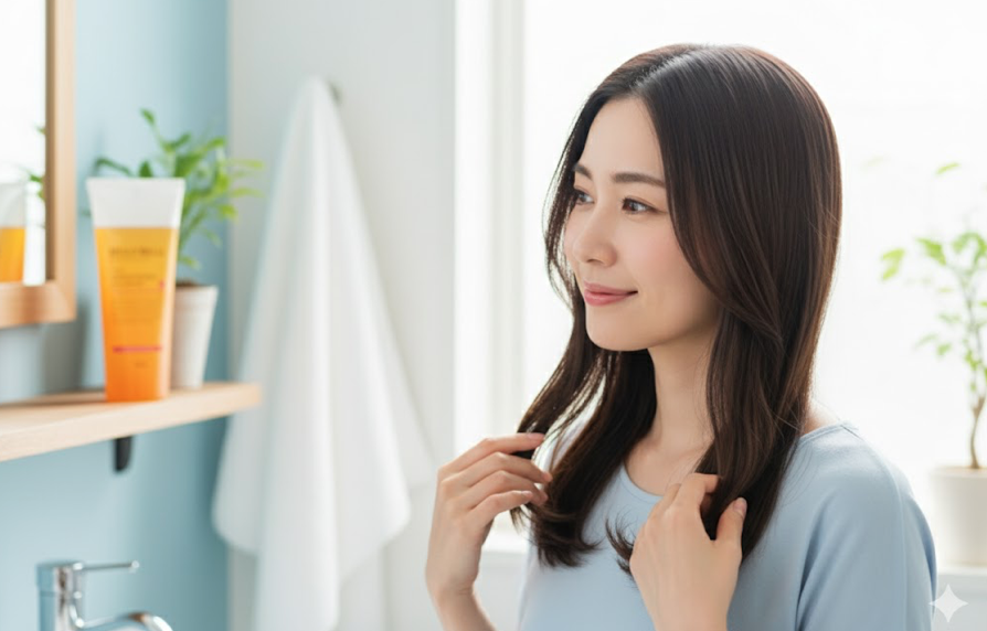 3. 十分にすすぐ:泡残りがないように地肌からしっかりと。タオルドライ後は、ドライヤーで根元から乾かすとまとまりやすくなります。