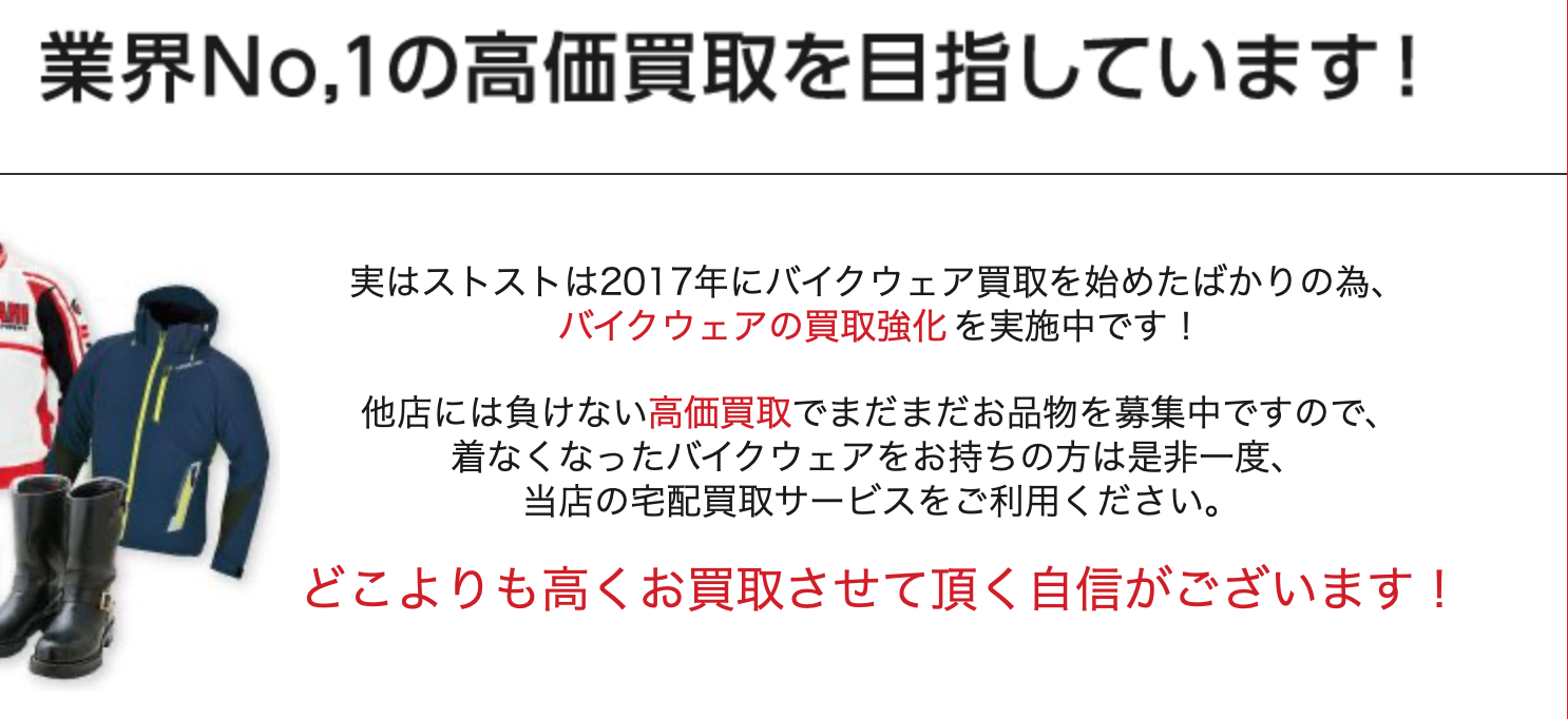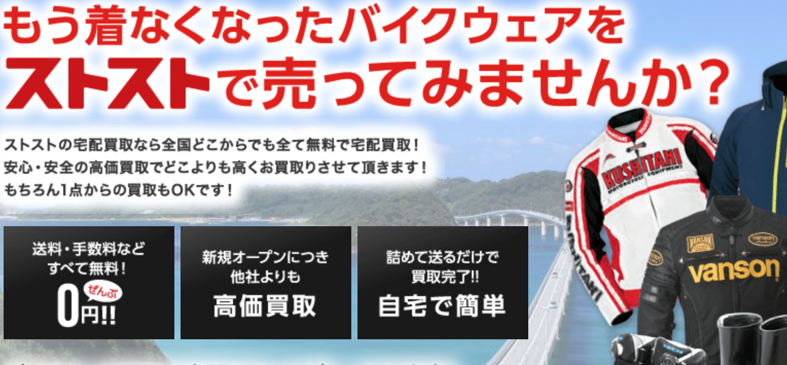 バイクウェアは意外と場所を取るアイテムですが、処分するにも価値がわからず踏み出せないこともあります。そんな時、自宅から送るだけで査定できるストストは非常に便利です。