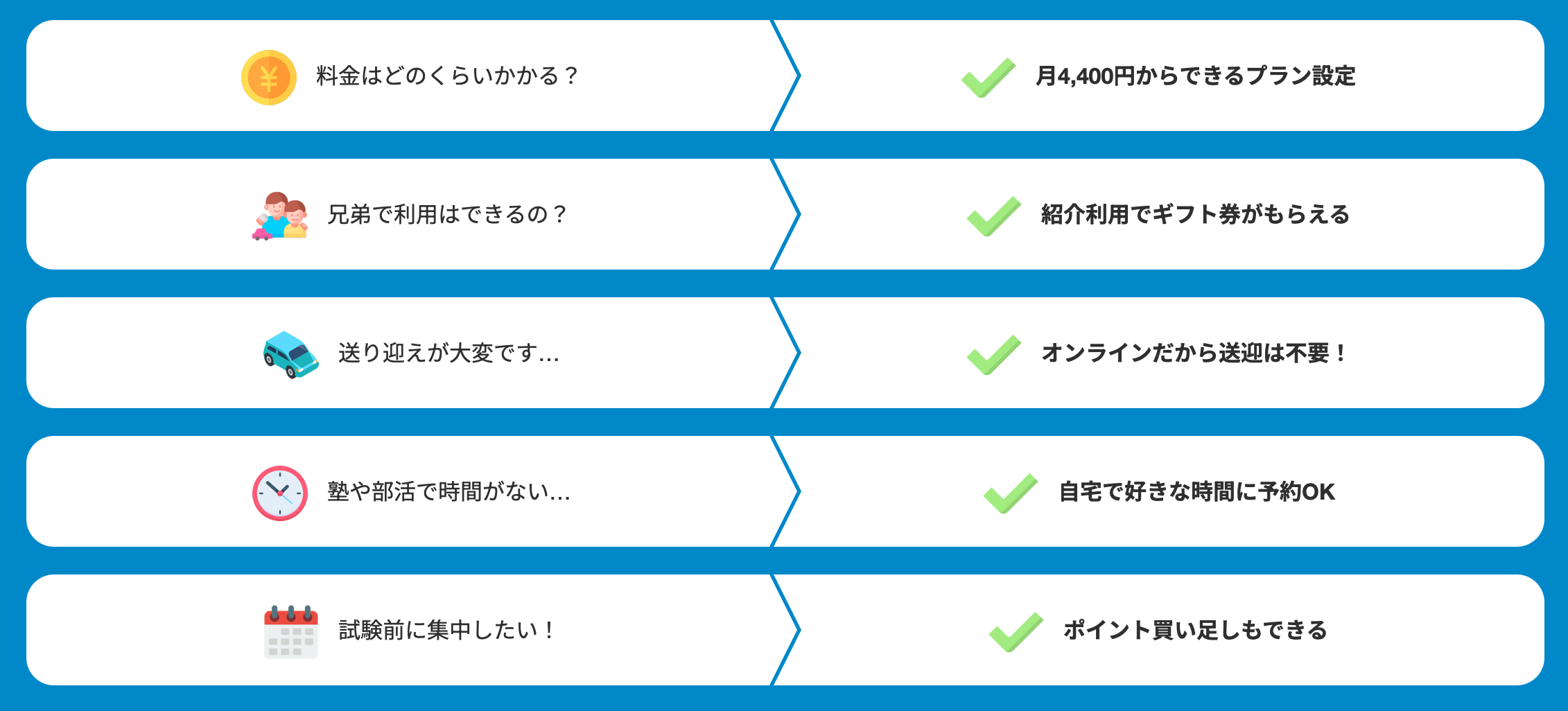 もちろん、英検やTOEICなどの資格対策、ビジネス英語、旅行英会話など、あなたのレベルや目的に合わせたレッスンも豊富に用意されています。