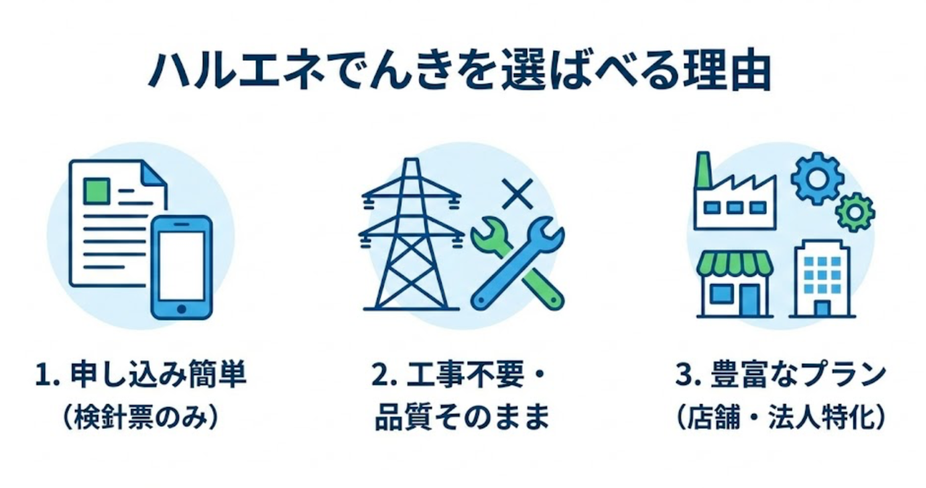 「ハルエネでんき」は、法人や個人事業主様に特化した新電力サービスです。全国の多くの店舗やオフィスで導入されており、今の設備はそのままで、電気代の削減を目指せるプランが充実しています。