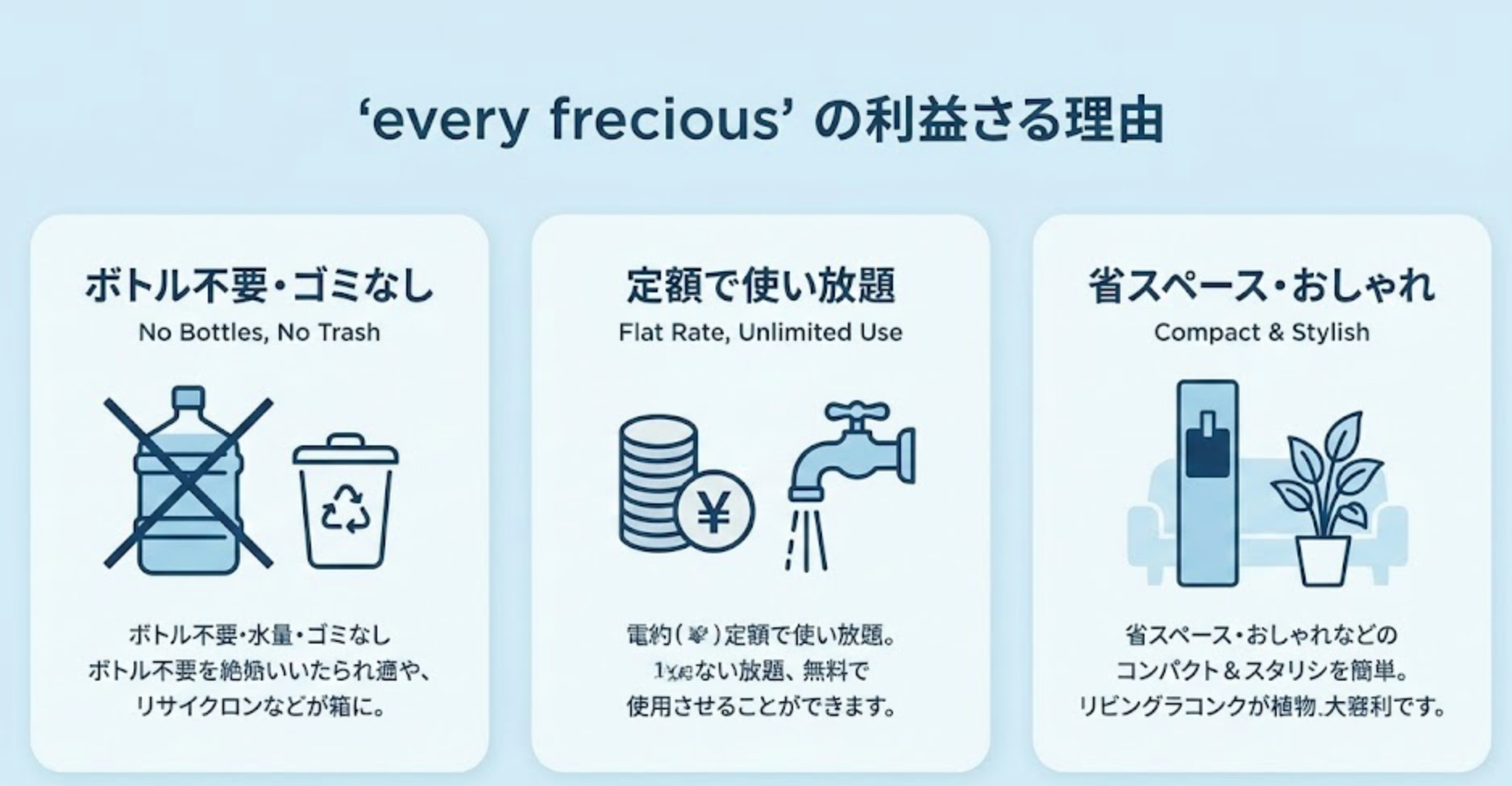 そんな悩めるあなたにおすすめなのが、浄水型ウォーターサーバー「every frecious(エブリィフレシャス)」です。