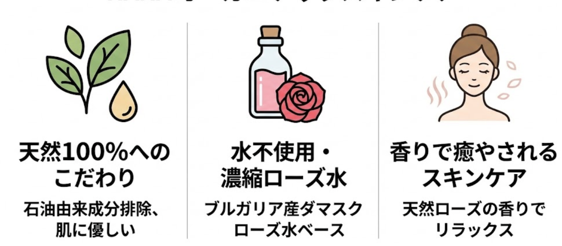 ただ「優しい」だけではありません。厳選された植物の力が、乱れがちな肌のリズムにアプローチ。塗った瞬間に広がる天然ローズの香りは、スキンケアを「義務」から「癒やしの時間」へと変えてくれます。