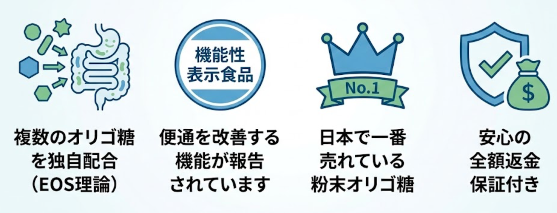 従来の「1種類のオリゴ糖」ではなく、相性の異なる複数のオリゴ糖を組み合わせることで、腸内の様々なビフィズス菌にアプローチする独自の「EOS(Enteric Oligosaccharide System)理論」を採用しています。