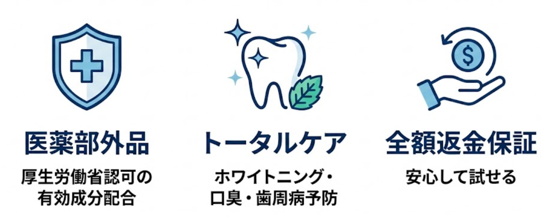 厚生労働省から認められた「医薬部外品」です。歯を白くするだけでなく、歯周病予防、口臭防止、虫歯の発生予防など、お口のトラブルを多角的にケアします。