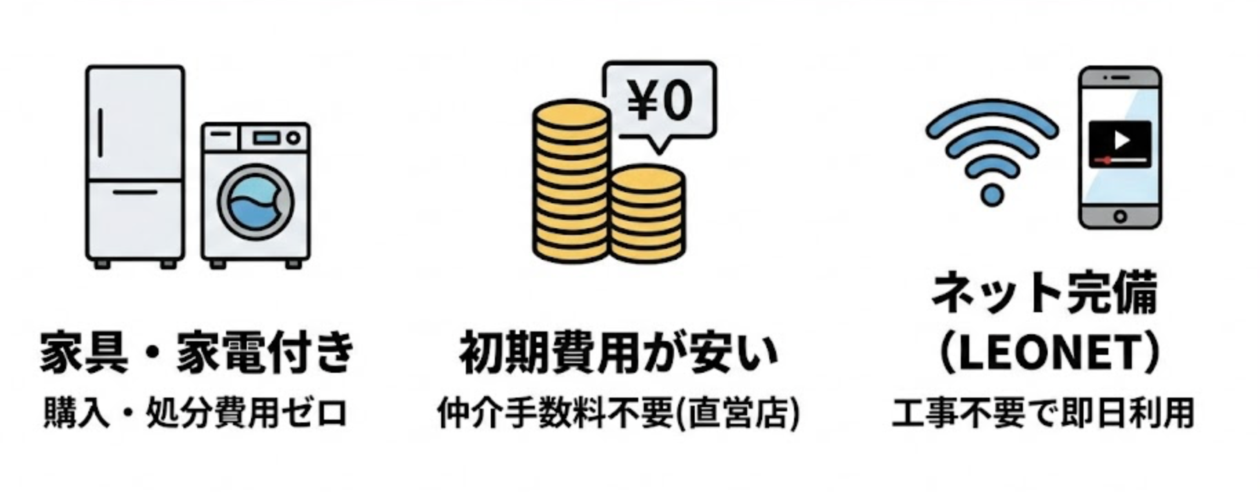 特に、「初期費用をとにかく抑えたい学生さん」「急な辞令で家を探す時間がない社会人の方」にとって、ライフラインと家具が揃った状態ですぐに入居できる点は、他にはない大きな価値です。
