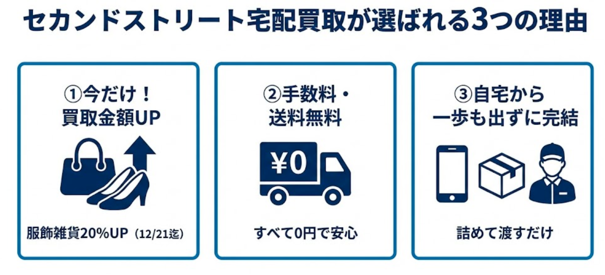 そんな悩みをスマートに解決するのが、全国800店舗以上の実績を持つセカンドストリートの宅配買取です。スマホ一つで申し込み、箱に詰めて待つだけ。運送業者が自宅まで集荷に来てくれるので、重い荷物を運ぶ必要はありません。