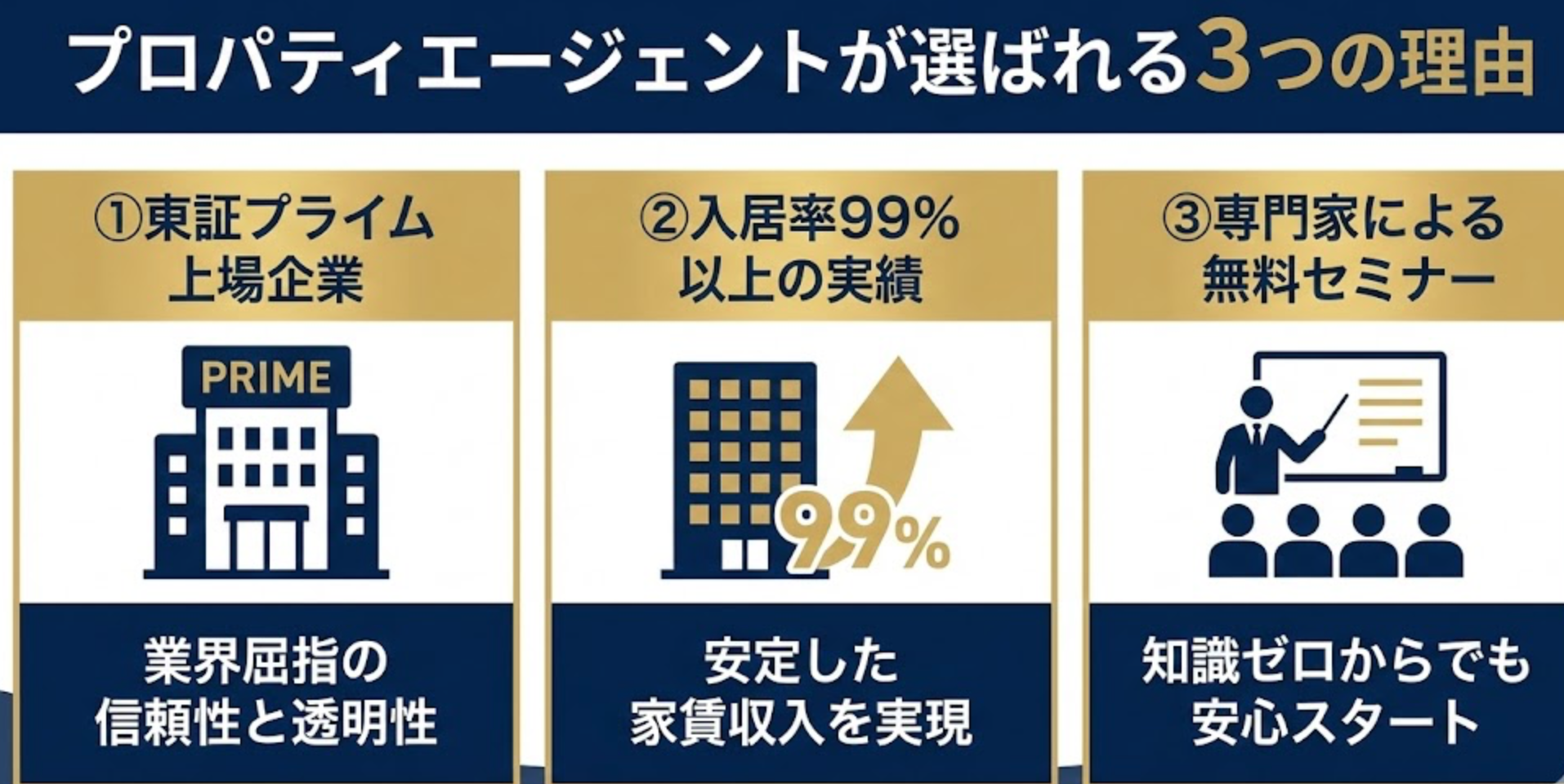 投資の不安を解消し、堅実な資産形成をサポートするのがプロパティエージェントです。業界でも屈指の信頼性を誇る上場企業として、透明性の高い情報提供を行っています。