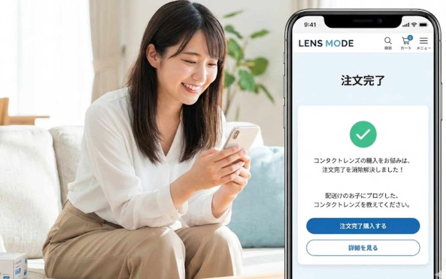 レンズモードを利用すれば、これまでの「高い・面倒・時間がかかる」というコンタクト購入のストレスから完全に解放されます。