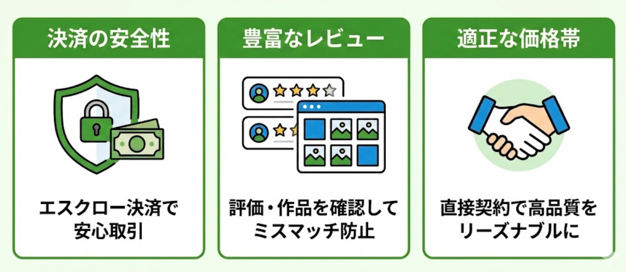 豊富なレビュー 過去の利用者の評価やポートフォリオを確認でき、ミスマッチを防げる。