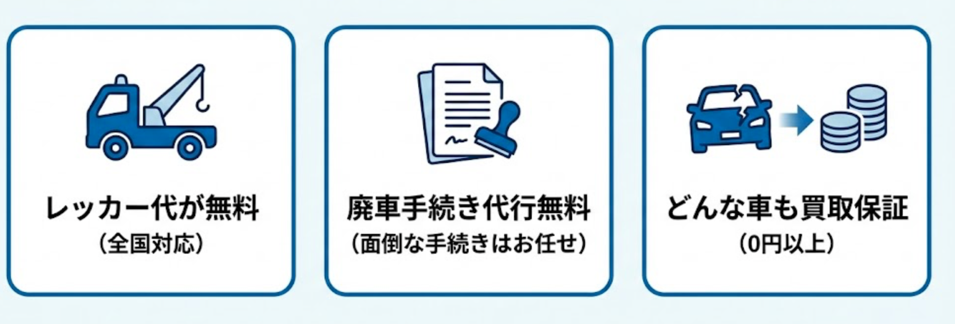 レッカー代が無料 動かない車でも、全国どこでも無料で引き取りに来てくれます。