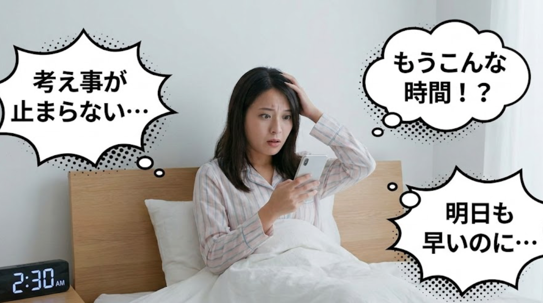 忙しい一日を終えて、やっと布団に入ったのに、頭の中で考え事が止まらない。時計を見るたびに「早く寝なきゃ」と焦りが募り、余計に目が冴えてしまう…。