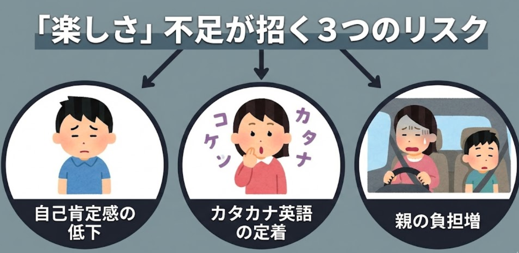 「いつか慣れるだろう」と我慢させ続けていると、子供の心には「英語=つまらないもの」という苦手意識が刻まれてしまいます。